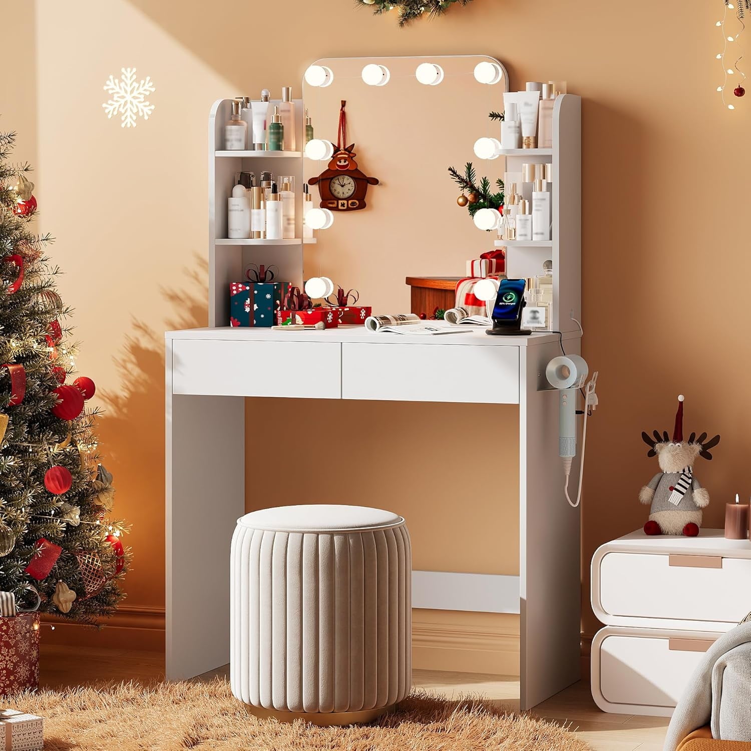 - 【Built-in Charging Station & Hair Dryer Holder】Keep your devices powered and your styling tools organized. This vanity includes 2 AC outlets, 2 USB ports, and a dedicated holder for your hair dryer. Everything stays within easy reach—no more unplugging or searching for power.