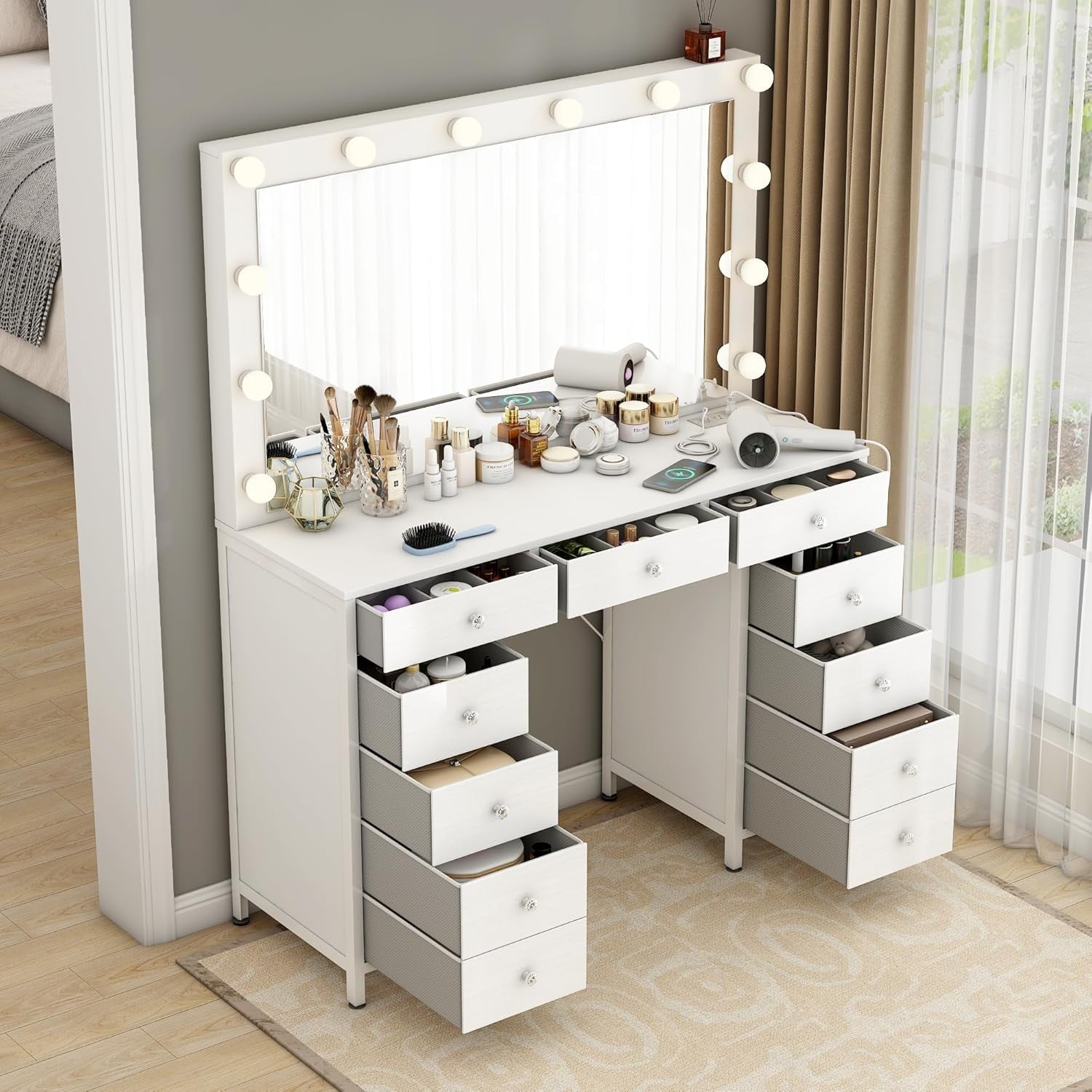- MODERN LUXURY DESIGN: Wood vanity with Hollywood-style 14 LED lights, crystal knobs & premium non-woven fabric drawers for light luxury elegance.
