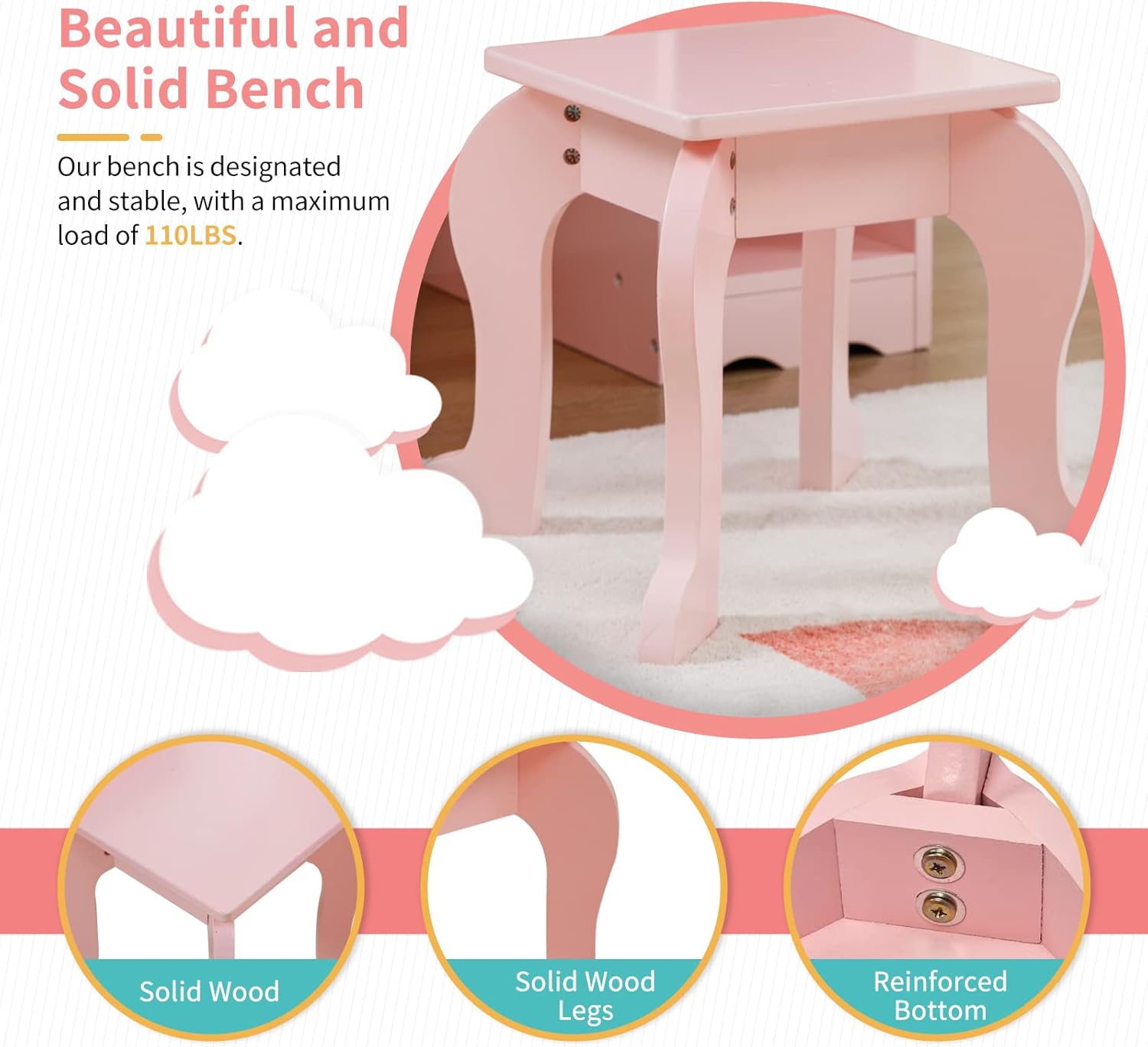 This elegant pink vanity table boasts a sophisticated design with charming clouds, hearts, and other delightful motifs that will satisfy any little maiden's vanity needs and make her bedroom look like a royal palace!