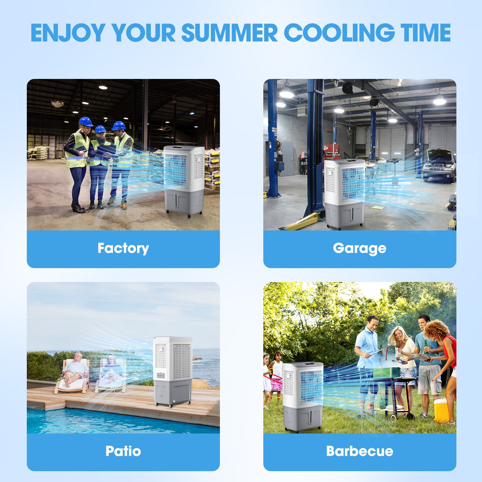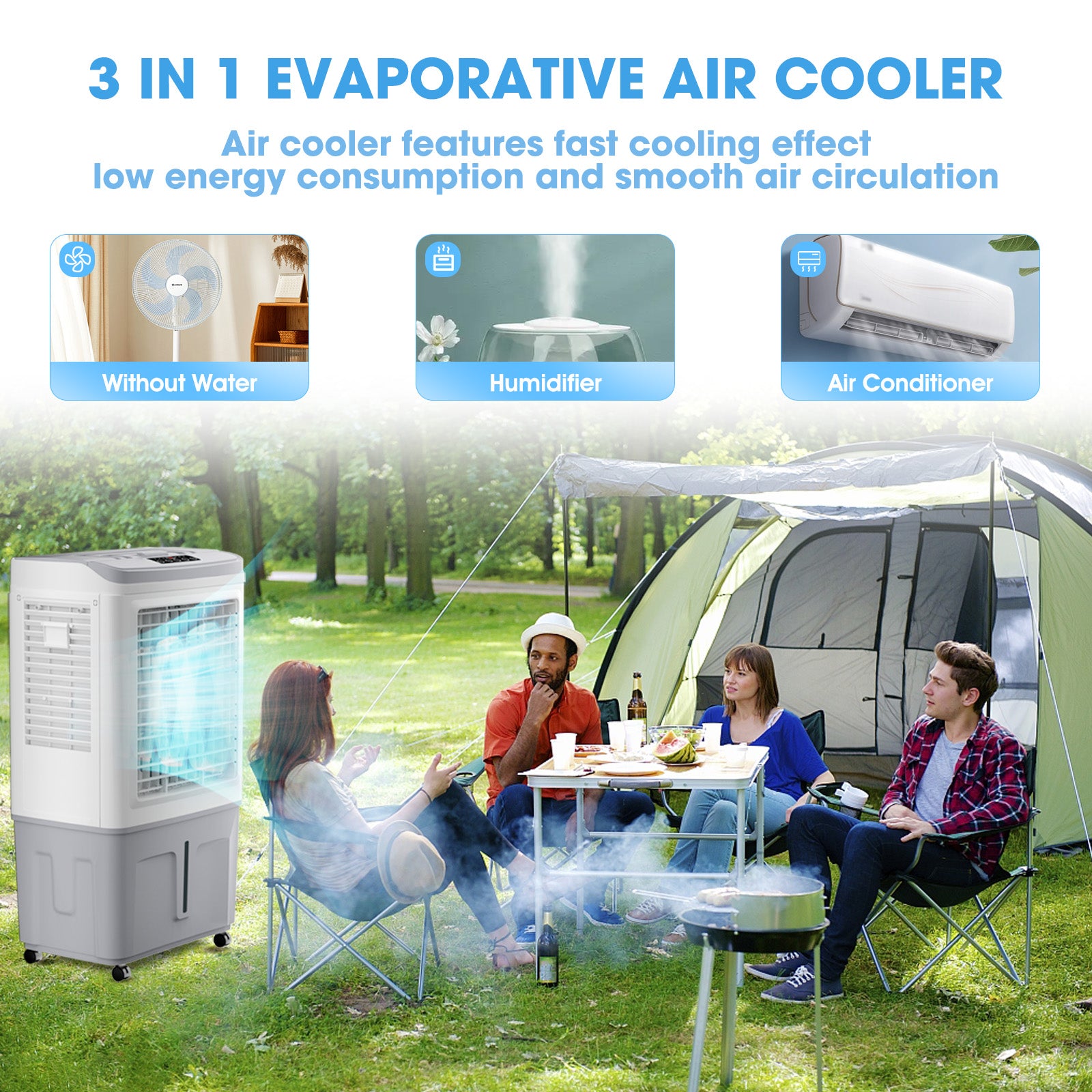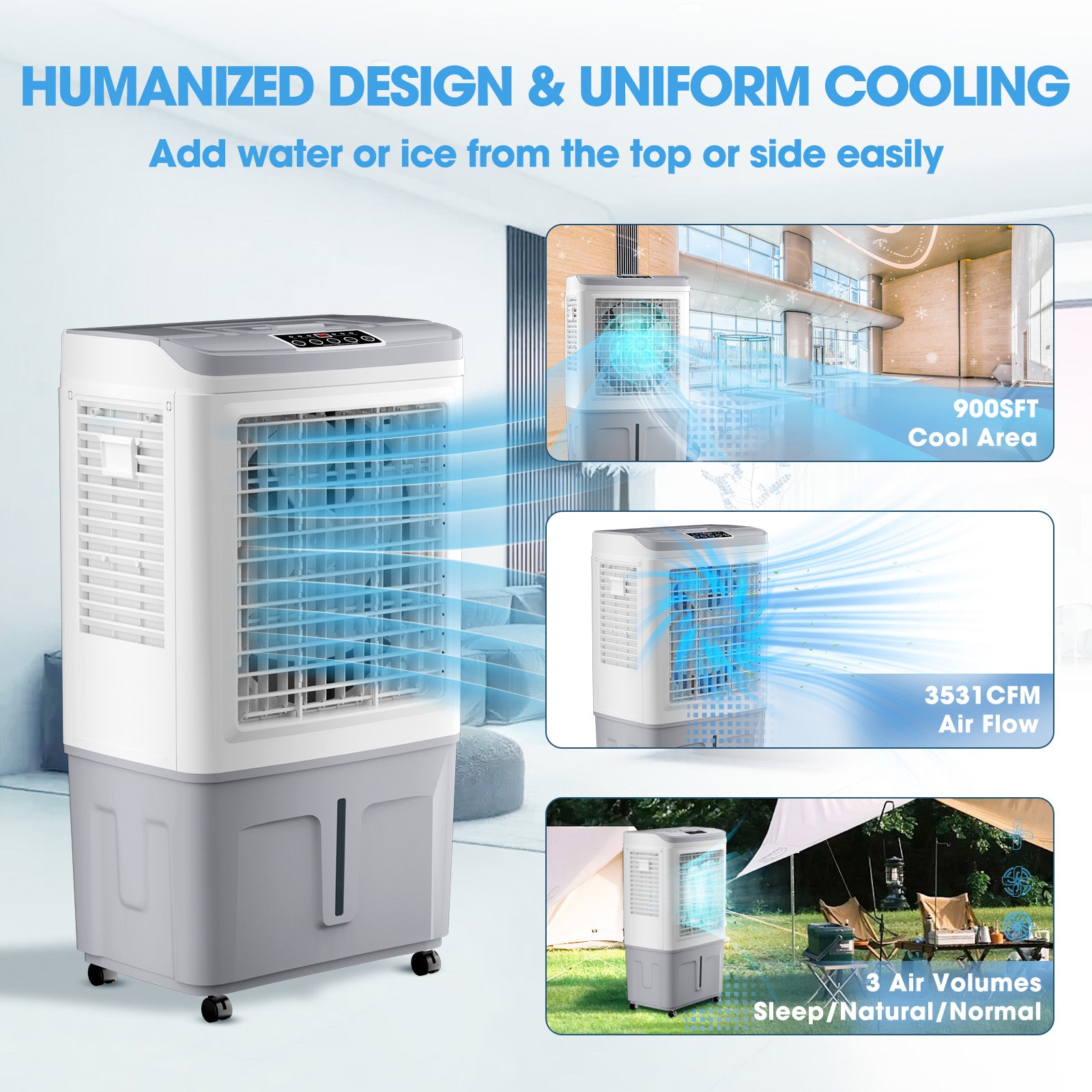 The 3 in 1 evaporative air cooler has multiple functions, not only as a fan, and humidifier but also as an air conditioner fan. You can choose different working modes according to different needs and weather conditions. With a powerful airflow of up to 3531CFM, this cooling fan can efficiently cool down any room or outdoor space in no time! This swamp cooler air conditioner is perfect for usesuch as garage, factory, patio, pool or even during outdoor activities such as camping or barbecue.