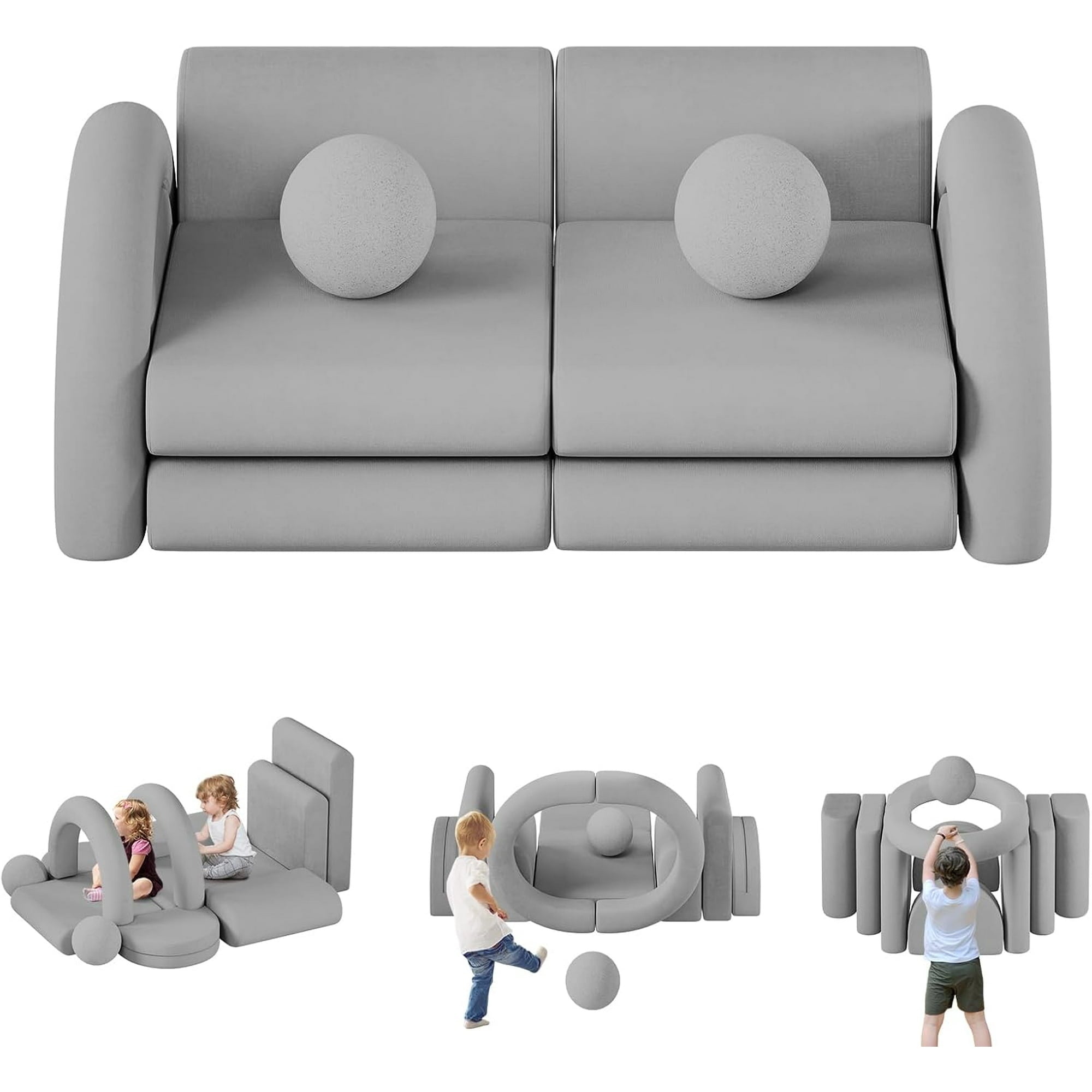 Wanan 12Pcs Modular Kids Play Couch with Balls and Tunnel, Toddler Sofa for Playroom, Gray