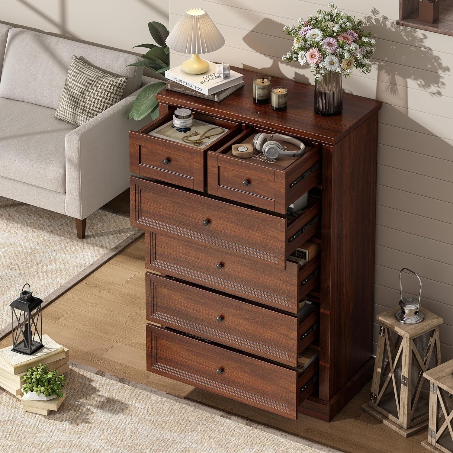 - Farmhouse Style Dresser: This tall chest of drawers features a charming farmhouse design, perfectly suited for bedroom or living room decor. Its elegant walnut finish and brushed hardware add a touch of rustic sophistication to your home.