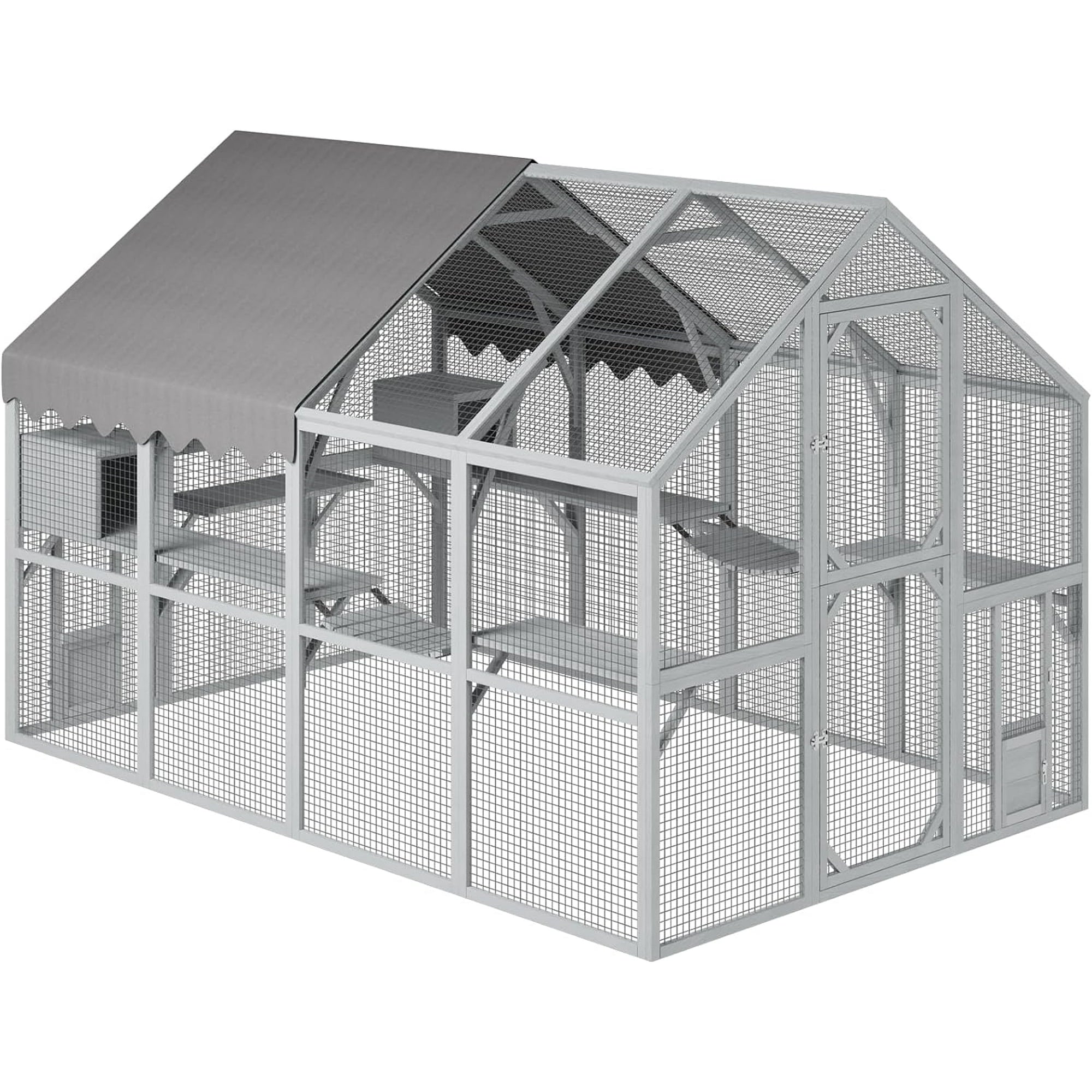 Akaber 112'' Catio Outdoor Cat Enclosure Super Large Wooden Catios for Cats Patio with Waterproof UV Protection Canopy, Outside Cat Run Enclosure Condon with Platforms, Small Houses, Bridges