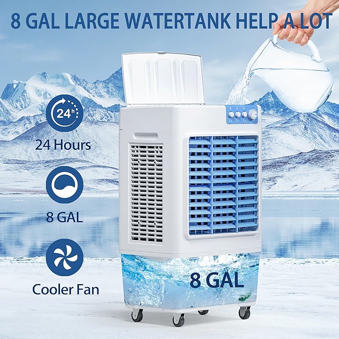 - LARGE WATER TANK FOR LONG-LASTING COOLING: Our air cooler for room features a large 8-gallon water tank , so you can enjoy hours of uninterrupted coolness without the need for frequent refills. Plus, it comes with two ice boxes to enhance the cooling effect even further! this swamp cooler can provide continuous and refreshing cool air for hours on end. It can help you enjoy a comfortable environment even during the hottest days of the year.