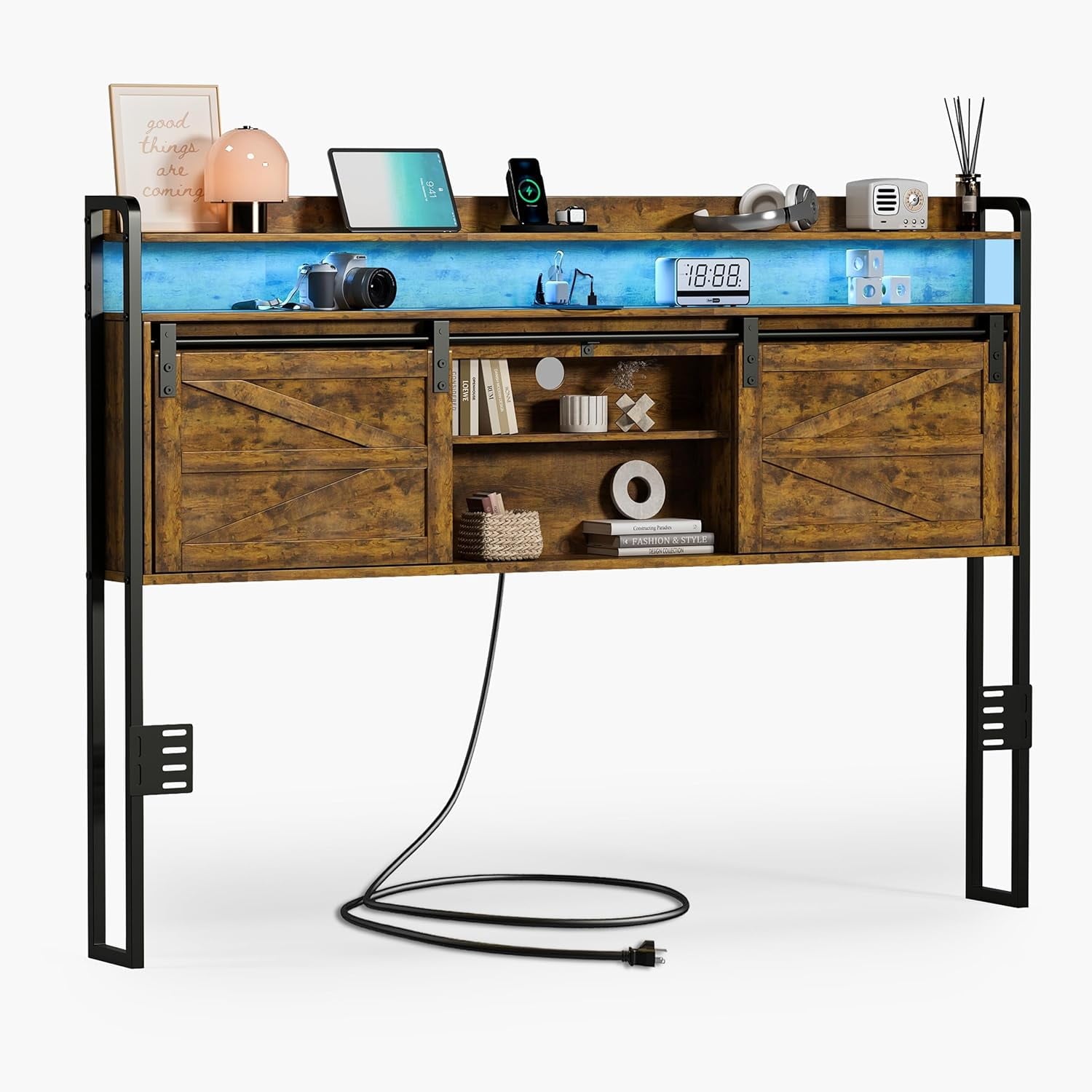 Headboard Queen Size, 3-Tier Storage Headboard with Outlets, USB Ports and LED Light, Queen Headboard Only with Sliding Barn Doors, Width Adjustable, Queen Headboard for Queen Size Beds