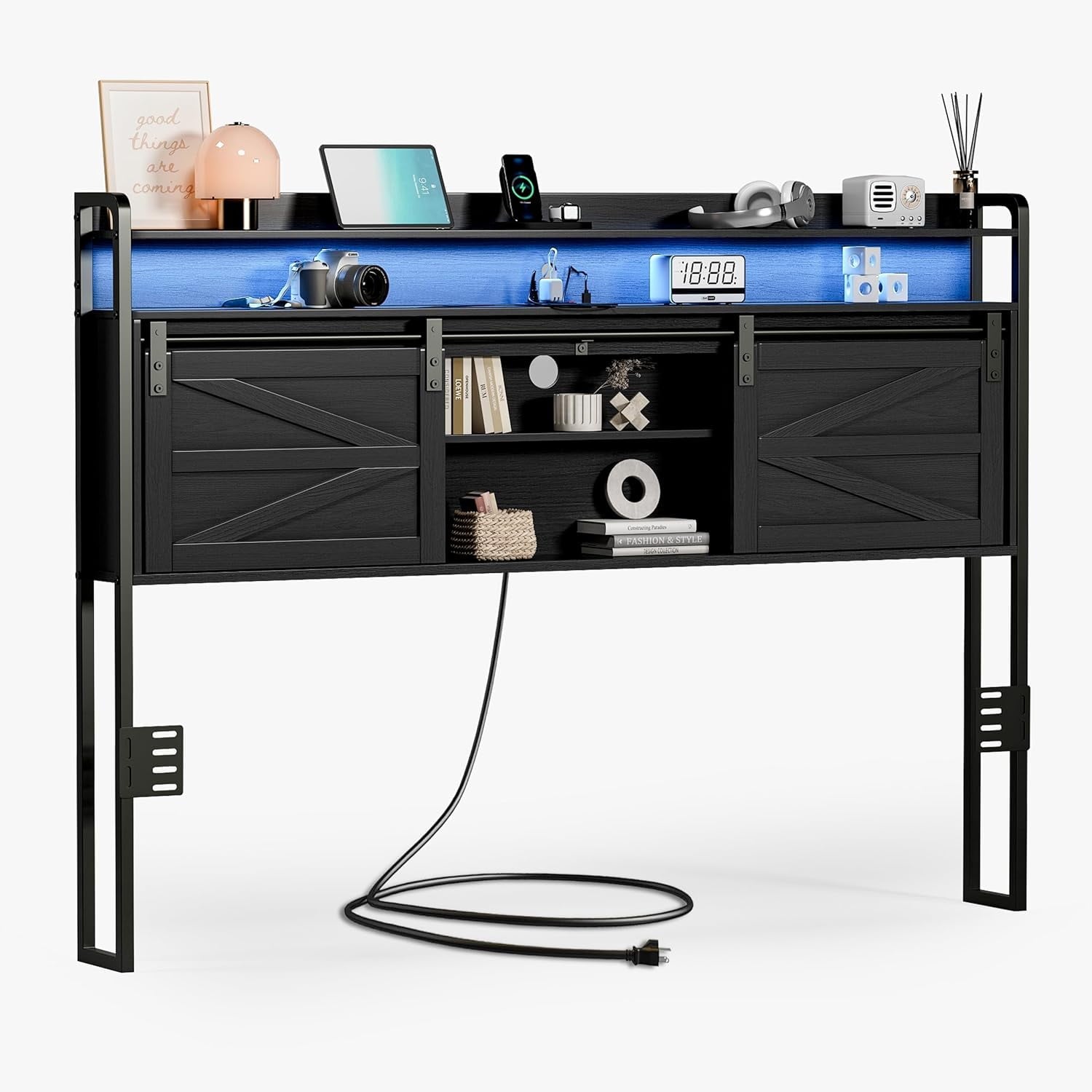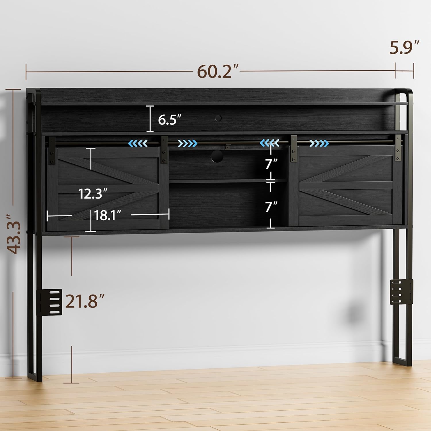 Headboard Queen Size, 3-Tier Storage Headboard with Outlets, USB Ports and LED Light, Queen Headboard Only with Sliding Barn Doors, Width Adjustable, Queen Headboard for Queen Size Beds