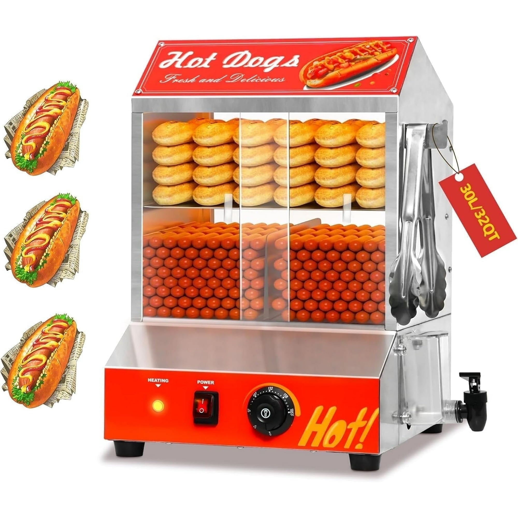 ICEELF 32QT Hot Dog Steamer, 1000W, 30 L, Holds 175 Hotdogs and 40 Buns, Commercial Hot Dog Steamer
