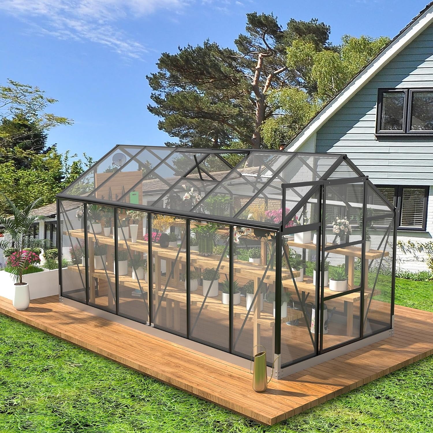 Linor Large Walk-in Greenhouse is built of reinforced poles, a sturdy aluminum frame, a galvanized steel base, and a slanted barn rooftop that can withstand any abuse, corrosion prevention, and wind resistance. Its UV-resistant polycarbonate material also provides a good thermal insulation effect and a high impact resistance, allowing you to protect your plants from cold, rain, scorching, and pets. You can safely nurse seedlings in them, and they're also great for storing garden tools, seeds, and plant pots. I believe you will not regret choosing it.