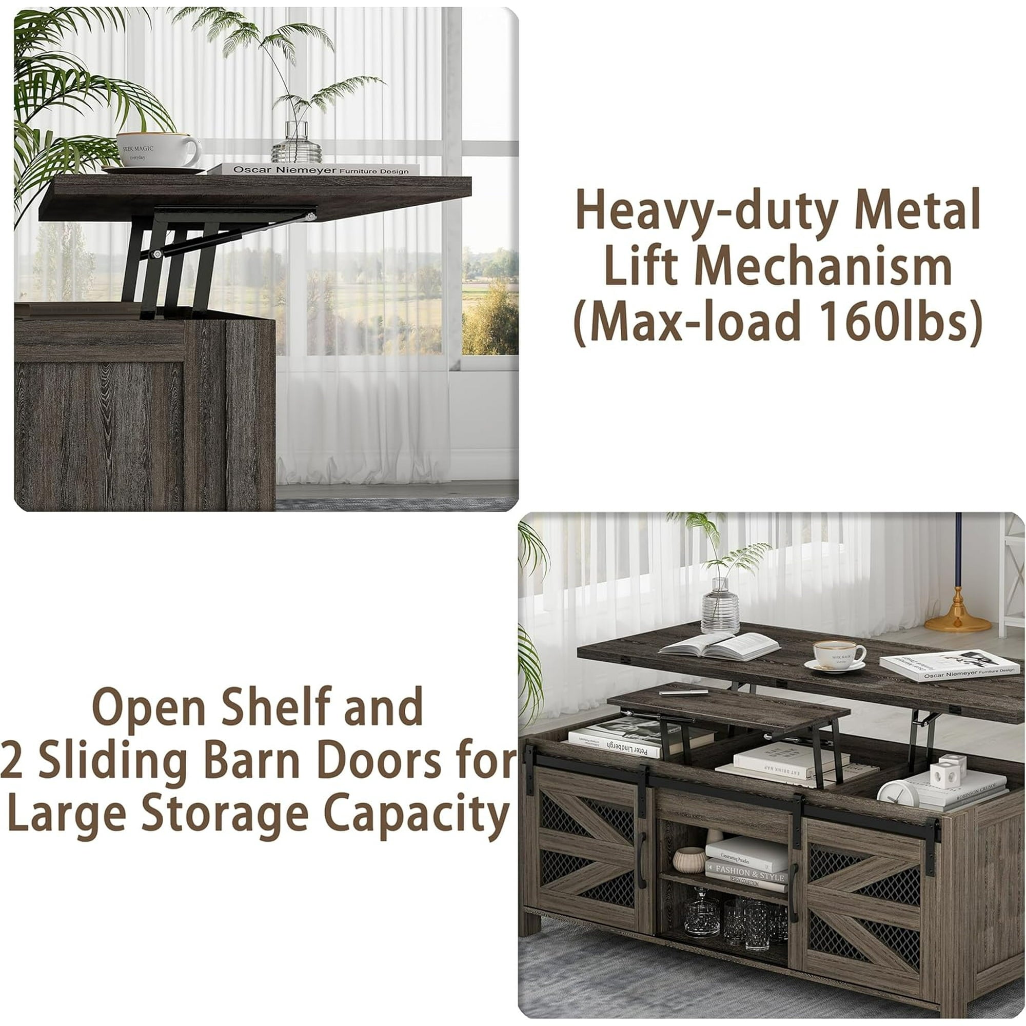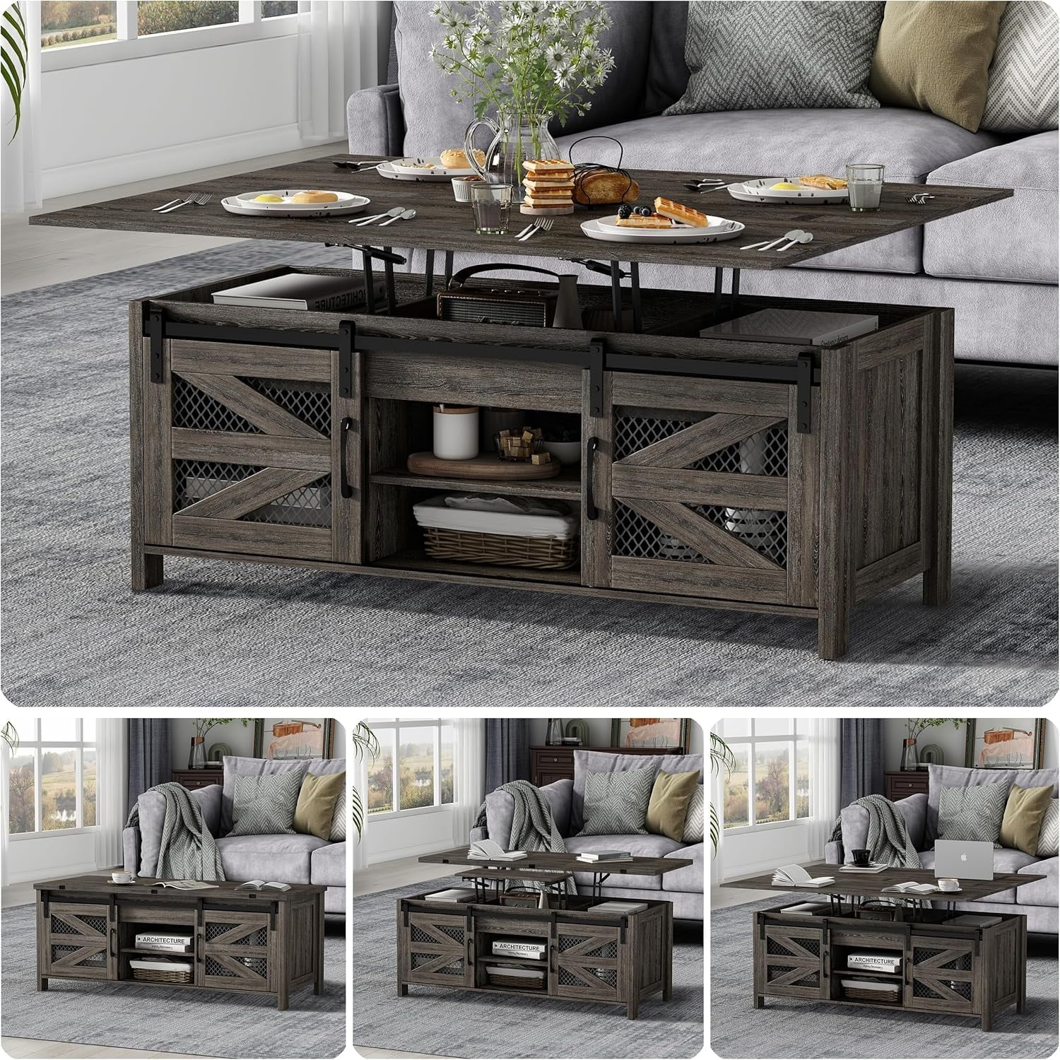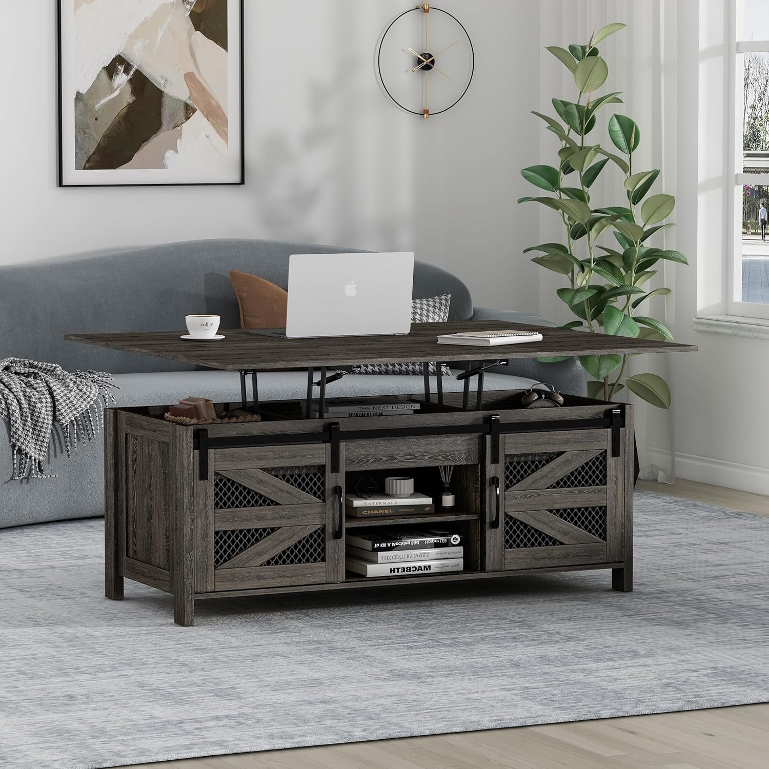 - Elevate your living room with the Linor 47.2" Lift Top Coffee Table, featuring a farmhouse-inspired design that creates an elegant and cozy atmosphere