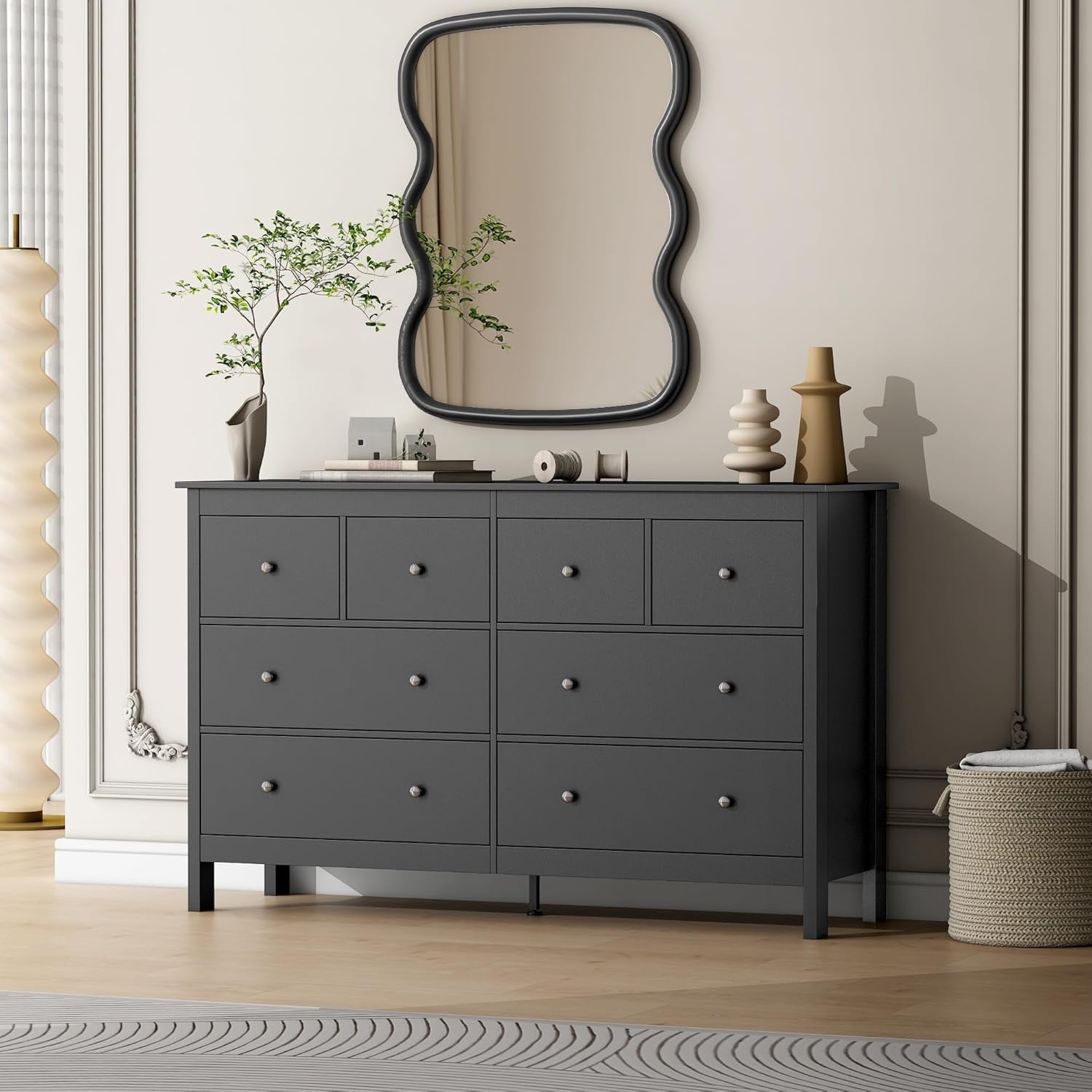 Linor 8 Drawer Dresser, 55" Modern White Dressers, Chest of Drawers, Wooden Wide Dresser for Bedroom, Living Room, Black