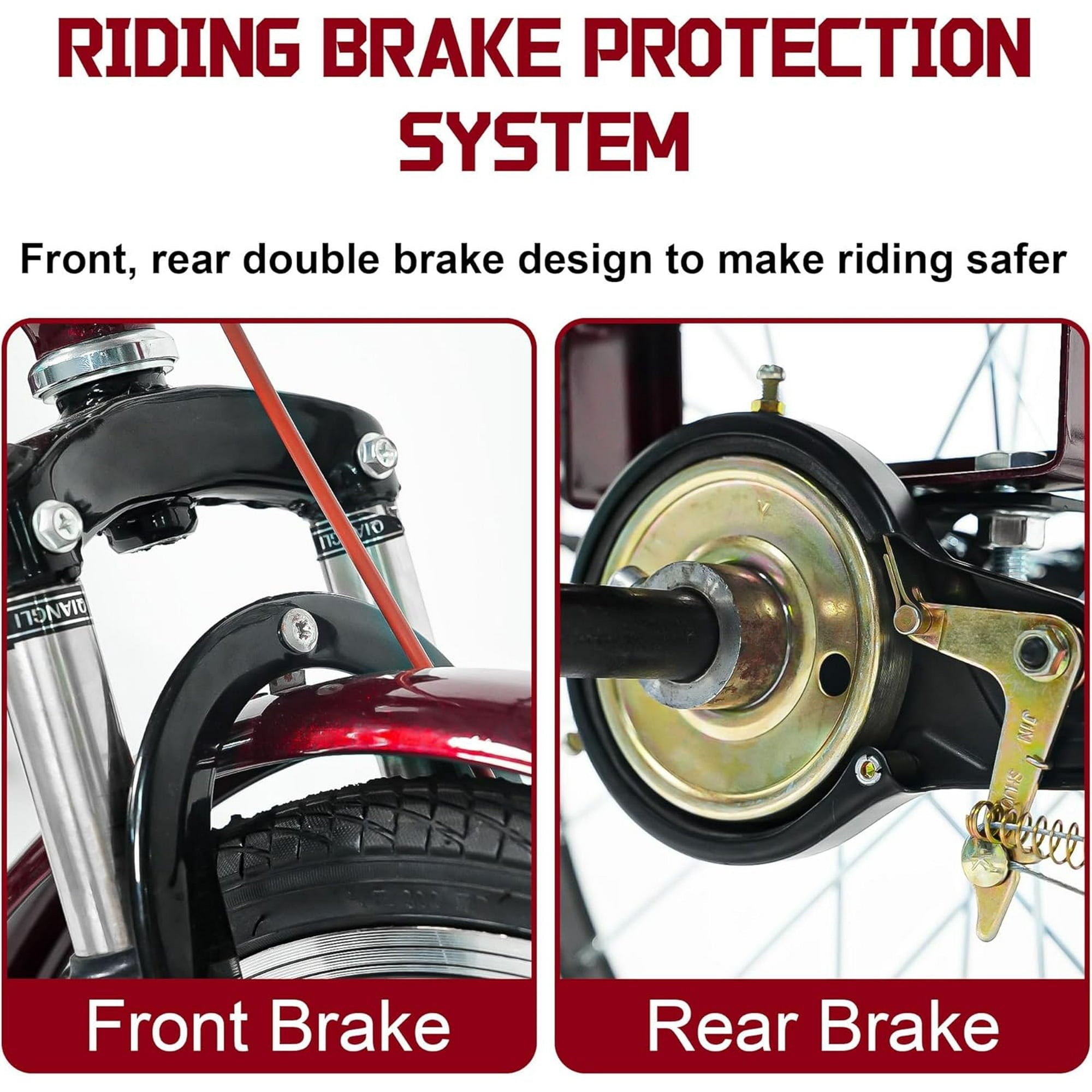 - Constructed with high-strength steel for a maximum capacity of 400 lbs, ensuring durability and safety. Comes with double brakes (front and rear), including caliper-type brakes on the front wheel and clamping brakes on the rear wheel, providing you with peace of mind while riding.