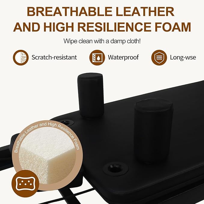 STRONG AND EASY TO CLEAN: This pilates table is made of all-steel construction, sturdy and stable up to 400 pounds. Flexible pulleys and rails allow for smooth use. The pilates reformer is lined with soft foam and the outer layer is made of polyurethane leather for comfortable use and can be cleaned with a damp cloth.